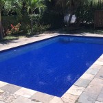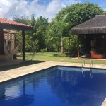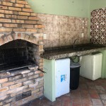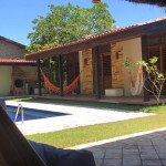 amplo jardim com piscina privativa e área de convivência, contendo churrasqueira, armadores de rede e uma linda mesa com cadeiras para que possam realizar as refeições;