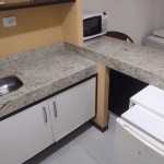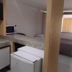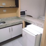 Cozinha equipada com geladeira, micro-ondas, bancada c/lava-loça