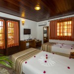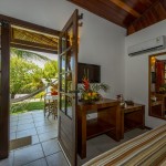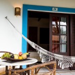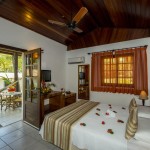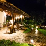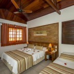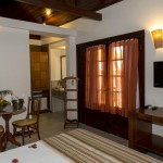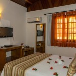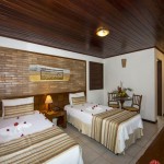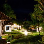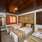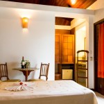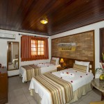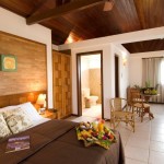 Chalés independentes com quartos duplos e suítes com ar condicionado split, ventilador de teto, banheira (com ou sem hidro), TV LCD, frigobar e telefone e música ambiente.